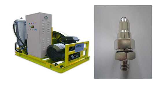 高壓射流清洗:是使用高壓泵打出高壓水,并經過一定管路到達噴嘴,再把高壓力低流速的水轉換為高壓力高流速的射流,然后射流以其很高的沖擊動能,連續不斷地作用在被清洗表面,從而使垢物脫落,最終實現清洗目的。
