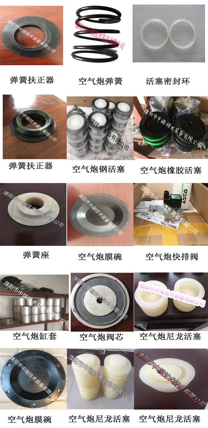 空氣炮配件主要是針對空氣炮易損件,空氣炮易損件主要有空氣炮缸套(空氣炮缸筒)、空氣炮活塞、空氣炮活塞環、空氣炮彈簧扶正器(空氣炮彈簧座)、空氣炮彈簧、空氣炮電磁閥(K2W-20、15)、空氣炮膜碗、空氣缸套是鋁合金材質,型號分為125、110兩種。因為活塞對外面的缸套光滑度要求高,長期使用需要更免漏氣。